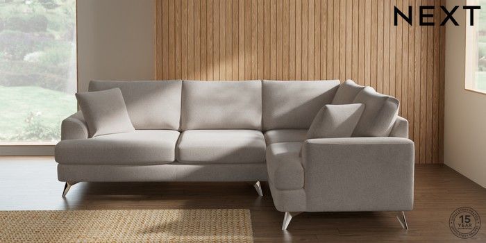 7.2.10 Buy Parker Medium Corner Sofa - Right Hand Chunky Chenille Oyster High Metal - Chrome from the Next UK online shop Click here to use our accessible website