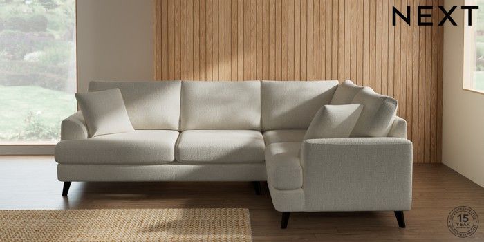 7.2.10 Buy Parker Medium Corner Sofa - Right Hand Chunky Texture Oyster Low Retro Tapered - Dark from the Next UK online shop Click here to use our accessible website