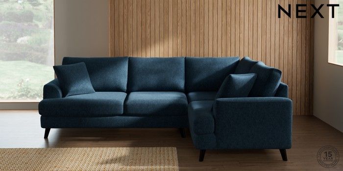 7.2.10 Buy Parker Medium Corner Sofa - Right Hand Cotswold Chenille Dark Blue Low Retro Tapered - Dark from the Next UK online shop Click here to use our accessible website