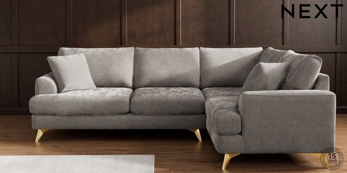 7.2.10 Buy Parker Medium Corner Sofa - Right Hand Distressed Velour French Grey High Metal - Brass from the Next UK online shop Click here to use our accessible website