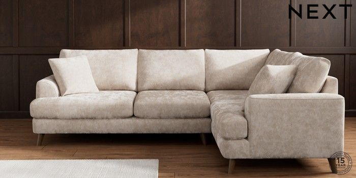 7.2.10 Buy Parker Medium Corner Sofa - Right Hand Distressed Velour Mid Natural Low Retro Tapered - Mid from the Next UK online shop Click here to use our accessible website