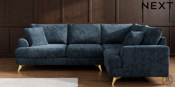 7.2.10 Buy Parker Medium Corner Sofa - Right Hand Distressed Velour Midnight Blue High Metal - Brass from the Next UK online shop Click here to use our accessible website