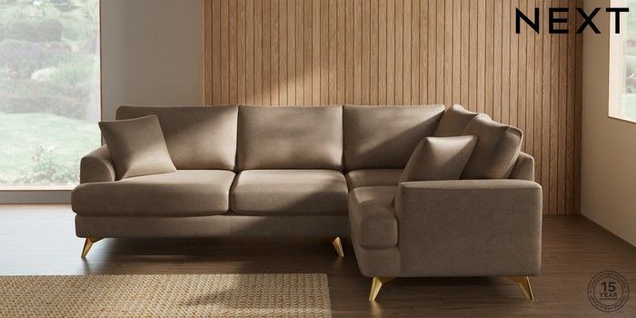 7.2.10 Buy Parker Medium Corner Sofa - Right Hand Luxe Chenille Mid Camel Beige High Metal - Brass from the Next UK online shop Click here to use our accessible website