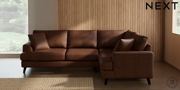 7.3.1 Buy Parker Medium Corner Sofa - Right Hand Monza Faux Leather Easy Clean Chestnut Brown Low Retro Tapered - Dark from the Next UK online shop Click here to use our accessible website