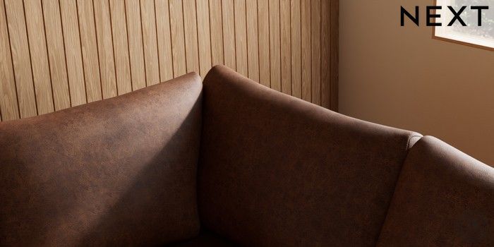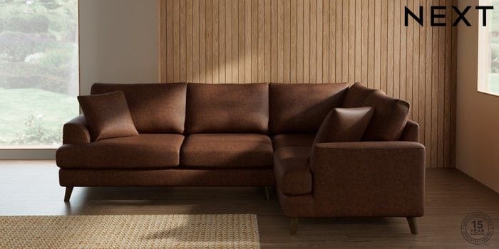 7.3.1 Buy Parker Medium Corner Sofa - Right Hand Monza Faux Leather Easy Clean Chestnut Brown Low Retro Tapered - Mid from the Next UK online shop Click here to use our accessible website