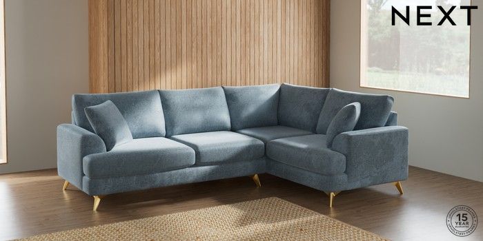 7.2.6 Buy Parker Medium Corner Sofa - Right Hand Plush Chenille Light Blue High Metal - Brass from the Next UK online shop Click here to use our accessible website