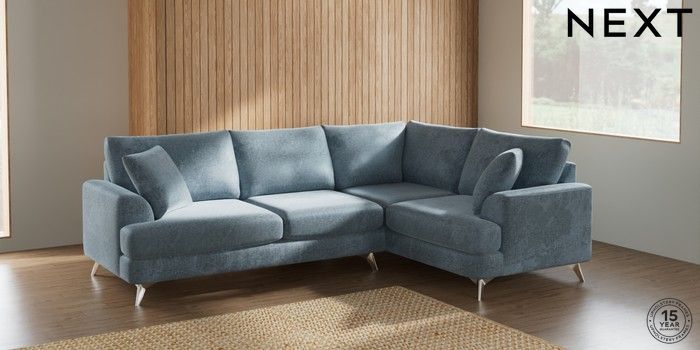 7.2.6 Buy Parker Medium Corner Sofa - Right Hand Plush Chenille Light Blue High Metal - Chrome from the Next UK online shop Click here to use our accessible website