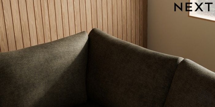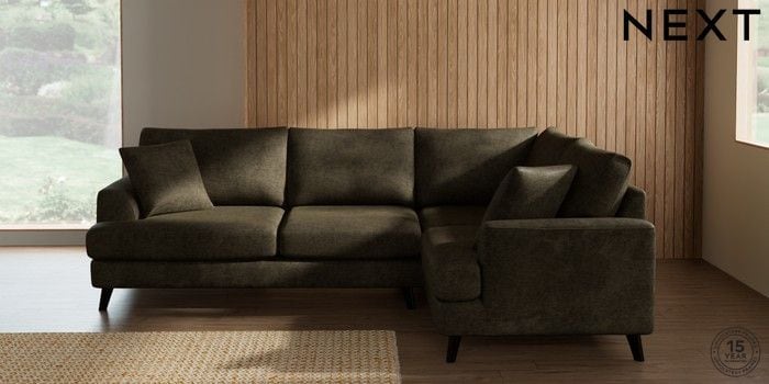 7.2.10 Buy Parker Medium Corner Sofa - Right Hand Plush Chenille Moss Green Low Retro Tapered - Dark from the Next UK online shop Click here to use our accessible website