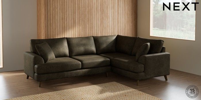 7.2.5 Buy Parker Medium Corner Sofa - Right Hand Plush Chenille Moss Green Low Retro Tapered - Mid from the Next UK online shop Click here to use our accessible website