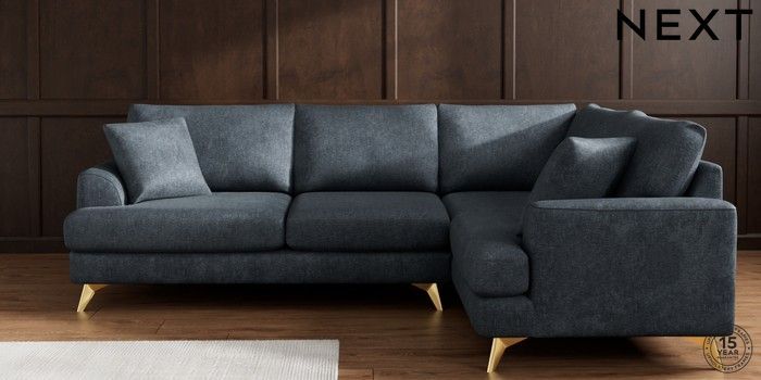 7.2.10 Buy Parker Medium Corner Sofa - Right Hand Plush Chenille Slate Blue High Metal - Brass from the Next UK online shop Click here to use our accessible website