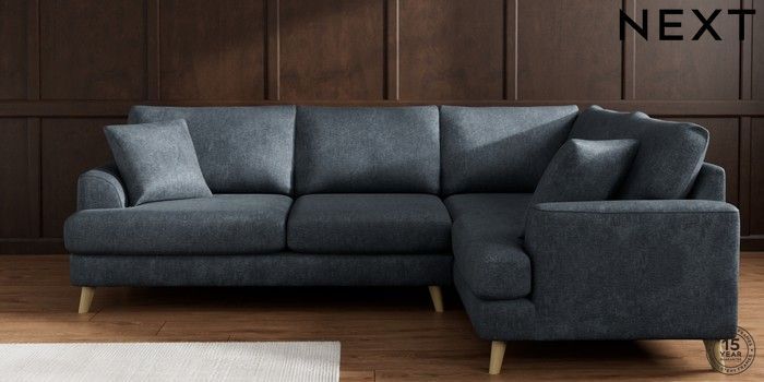 7.2.4 Buy Parker Medium Corner Sofa - Right Hand Plush Chenille Slate Blue Low Retro Tapered - Light from the Next UK online shop Click here to use our accessible website