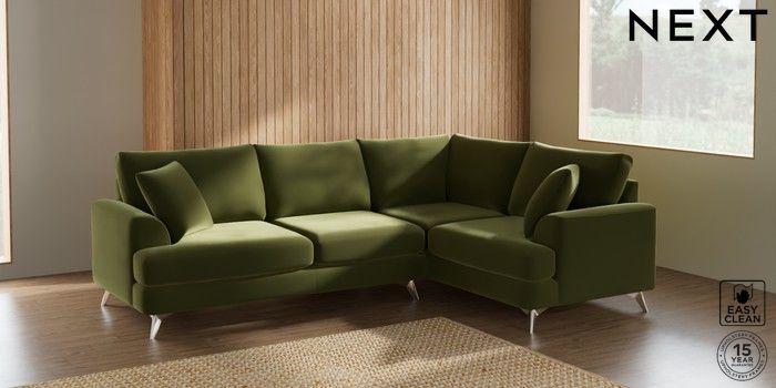 7.2.5 Buy Parker Medium Corner Sofa - Right Hand Plush Velvet Easy Clean Mid Olive Green High Metal - Chrome from the Next UK online shop Click here to use our accessible website