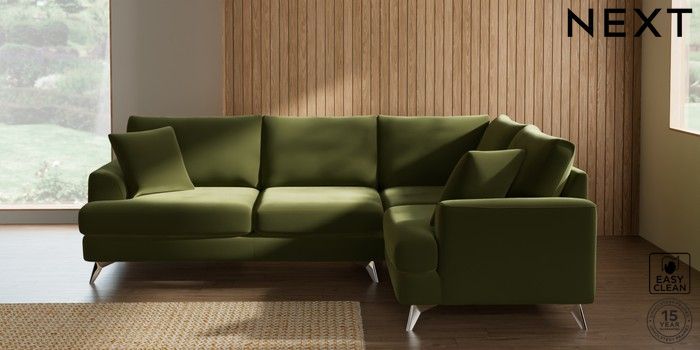 7.3.1 Buy Parker Medium Corner Sofa - Right Hand Plush Velvet Easy Clean Mid Olive Green High Metal - Chrome from the Next UK online shop Click here to use our accessible website