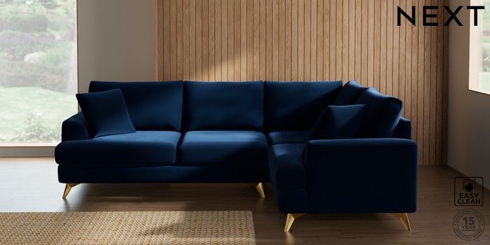 7.3.1 Buy Parker Medium Corner Sofa - Right Hand Plush Velvet Easy Clean Navy Blue High Metal - Brass from the Next UK online shop Click here to use our accessible website