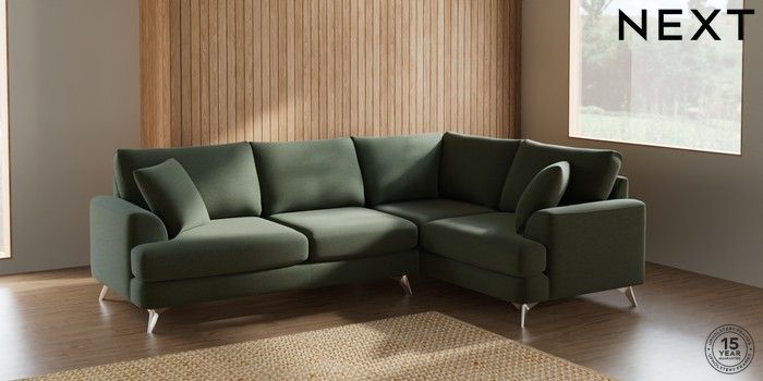 7.2.5 Buy Parker Medium Corner Sofa - Right Hand Relaxed Linen Look Dark Green High Metal - Chrome from the Next UK online shop Click here to use our accessible website