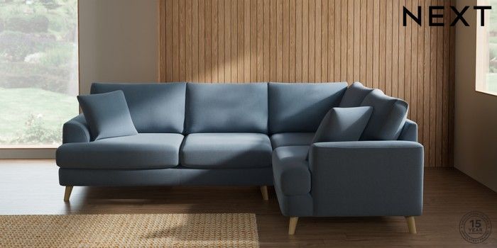 7.2.10 Buy Parker Medium Corner Sofa - Right Hand Relaxed Linen Look Mid Blue Low Retro Tapered - Light from the Next UK online shop Click here to use our accessible website