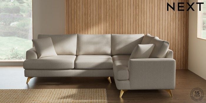 7.2.10 Buy Parker Medium Corner Sofa - Right Hand Tweedy Chenille Oyster High Metal - Brass from the Next UK online shop Click here to use our accessible website