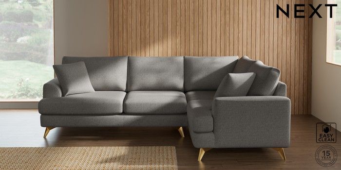7.2.10 Buy Parker Medium Corner Sofa - Right Hand Woven Chenille Easy Clean Light Grey High Metal - Brass from the Next UK online shop Click here to use our accessible website