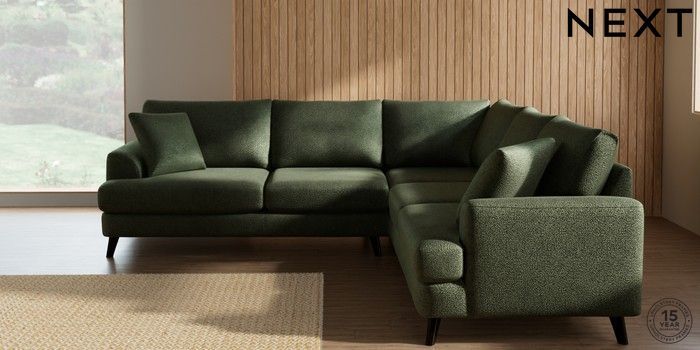 7.2.10 Buy Parker Medium Corner Sofa - Universal Boucle Chenille Dark Moss Green Low Retro Tapered - Dark from the Next UK online shop Click here to use our accessible website