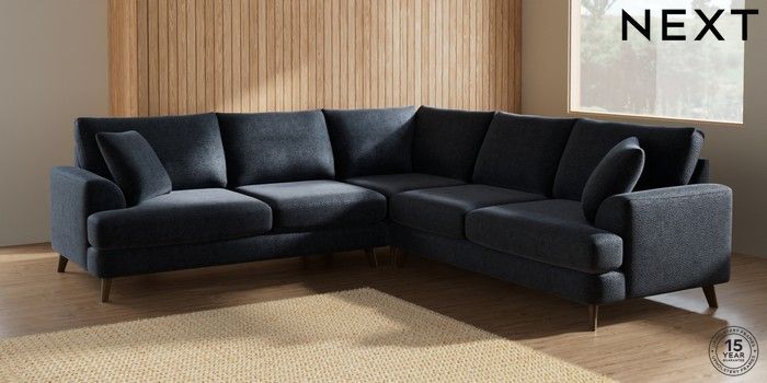7.2.5 Buy Parker Medium Corner Sofa - Universal Boucle Chenille Dark Slate Blue Low Retro Tapered - Mid from the Next UK online shop Click here to use our accessible website