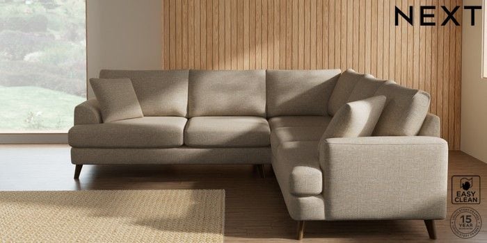 7.2.10 Buy Parker Medium Corner Sofa - Universal Boucle Weave Easy Clean Dark Natural Low Retro Tapered - Mid from the Next UK online shop Click here to use our accessible website