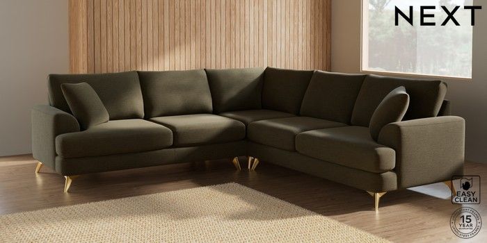 7.2.5 Buy Parker Medium Corner Sofa - Universal Fine Chenille Easy Clean Dark Moss Green High Metal - Brass from the Next UK online shop Click here to use our accessible website