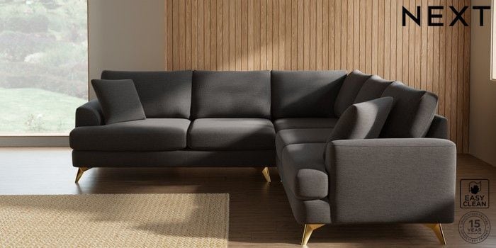 7.2.10 Buy Parker Medium Corner Sofa - Universal Fine Chenille Easy Clean Dark Smoke Grey High Metal - Brass from the Next UK online shop Click here to use our accessible website