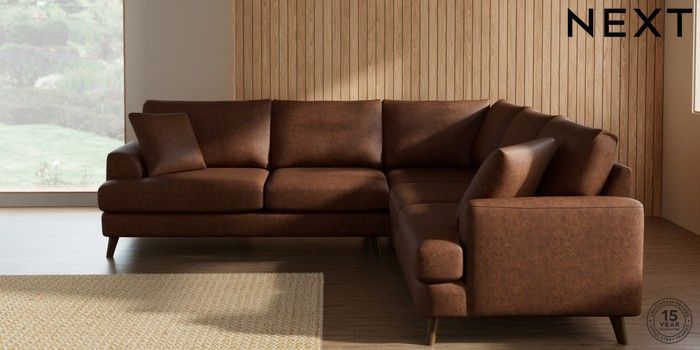 7.3.1 Buy Parker Medium Corner Sofa - Universal Monza Faux Leather Easy Clean Chestnut Brown Low Retro Tapered - Mid from the Next UK online shop Click here to use our accessible website