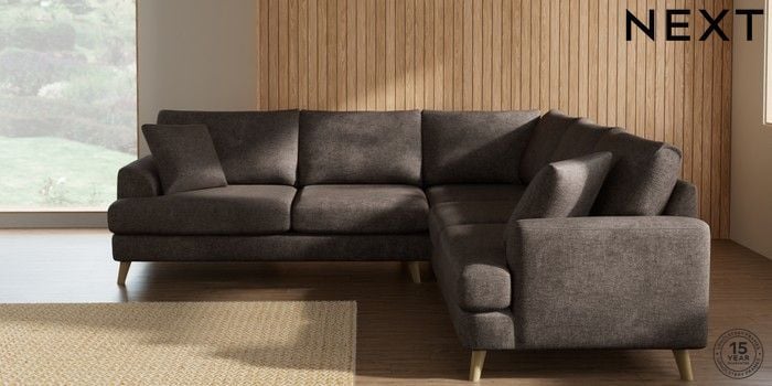7.2.10 Buy Parker Medium Corner Sofa - Universal Plush Chenille Mink Brown Low Retro Tapered - Light from the Next UK online shop Click here to use our accessible website