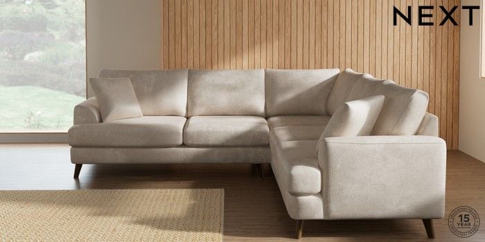 7.2.10 Buy Parker Medium Corner Sofa - Universal Plush Chenille Oyster Low Retro Tapered - Mid from the Next UK online shop Click here to use our accessible website