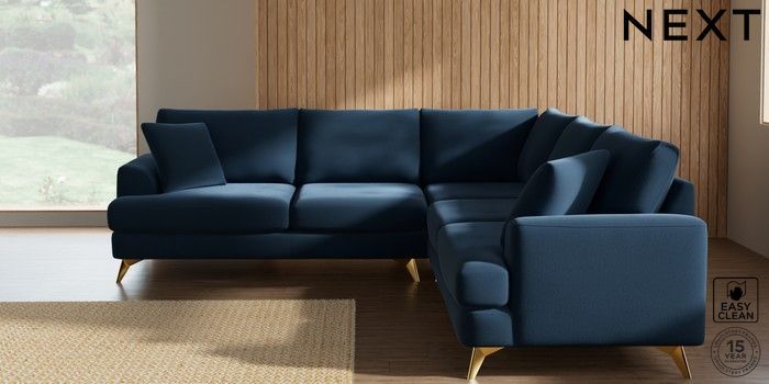 7.2.10 Buy Parker Medium Corner Sofa - Universal Plush Velvet Easy Clean Airforce Blue High Metal - Brass from the Next UK online shop Click here to use our accessible website
