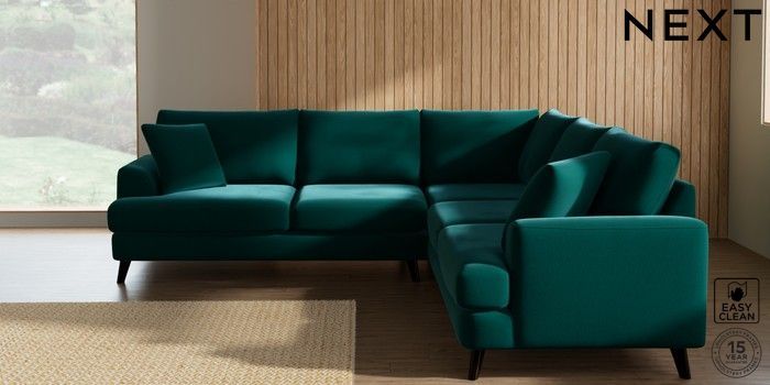 7.2.10 Buy Parker Medium Corner Sofa - Universal Plush Velvet Easy Clean Juniper Green Low Retro Tapered - Dark from the Next UK online shop Click here to use our accessible website
