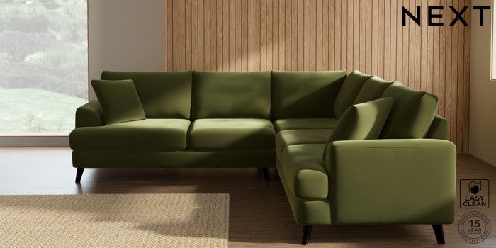 7.3.1 Buy Parker Medium Corner Sofa - Universal Plush Velvet Easy Clean Mid Olive Green Low Retro Tapered - Dark from the Next UK online shop Click here to use our accessible website