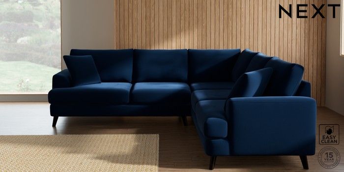 7.2.10 Buy Parker Medium Corner Sofa - Universal Plush Velvet Easy Clean Navy Blue Low Retro Tapered - Dark from the Next UK online shop Click here to use our accessible website