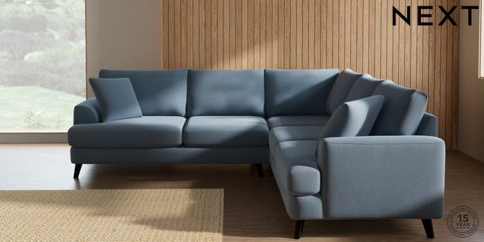 7.2.10 Buy Parker Medium Corner Sofa - Universal Relaxed Linen Look Mid Blue Low Retro Tapered - Dark from the Next UK online shop Click here to use our accessible website