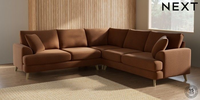 7.2.5 Buy Parker Medium Corner Sofa - Universal Ripple Chenille Mid Rust Brown Low Retro Tapered - Light from the Next UK online shop Click here to use our accessible website
