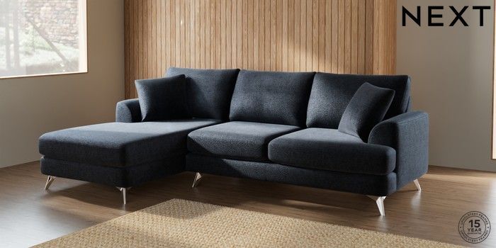 7.2.5 Buy Parker Medium Sofa Chaise - Left Hand Boucle Chenille Dark Slate Blue High Metal - Chrome from the Next UK online shop Click here to use our accessible website