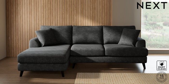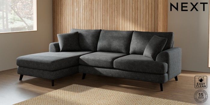 7.2.4 Buy Parker Medium Sofa Chaise - Left Hand Boucle Weave Easy Clean Charcoal Grey Low Retro Tapered - Dark from the Next UK online shop Click here to use our accessible website