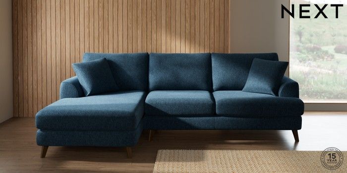 7.2.10 Buy Parker Medium Sofa Chaise - Left Hand Cotswold Chenille Dark Blue Low Retro Tapered - Mid from the Next UK online shop Click here to use our accessible website