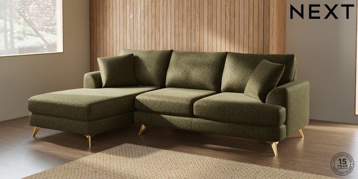 7.2.5 Buy Parker Medium Sofa Chaise - Left Hand Cotswold Chenille Dark Green High Metal - Brass from the Next UK online shop Click here to use our accessible website