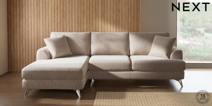 7.2.10 Buy Parker Medium Sofa Chaise - Left Hand Cotswold Chenille Light Natural High Metal - Chrome from the Next UK online shop Click here to use our accessible website