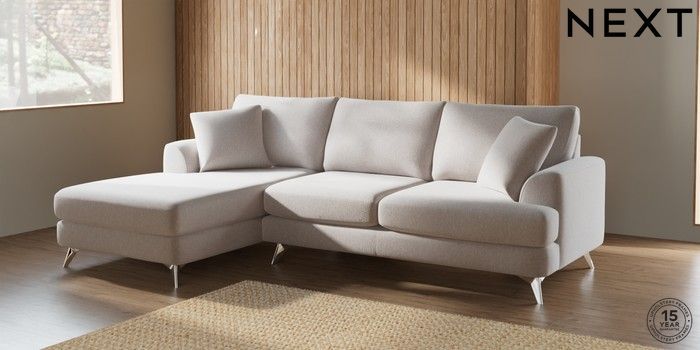 7.2.5 Buy Parker Medium Sofa Chaise - Left Hand Cotswold Chenille Oyster High Metal - Chrome from the Next UK online shop Click here to use our accessible website