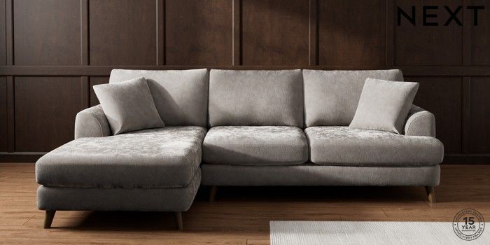 7.3.1 Buy Parker Medium Sofa Chaise - Left Hand Distressed Velour French Grey Low Retro Tapered - Mid from the Next UK online shop Click here to use our accessible website