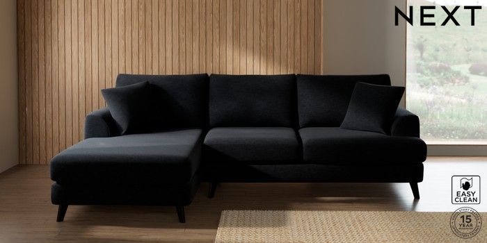 7.2.10 Buy Parker Medium Sofa Chaise - Left Hand Fine Chenille Easy Clean Black Low Retro Tapered - Dark from the Next UK online shop Click here to use our accessible website