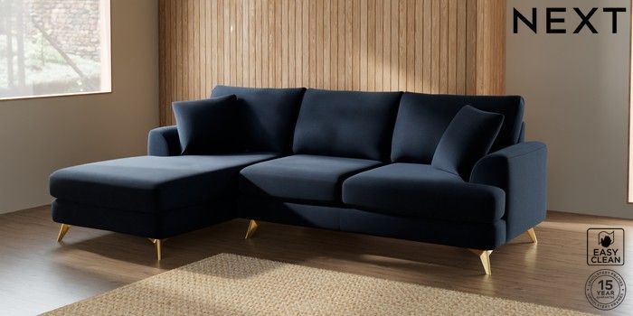 7.2.5 Buy Parker Medium Sofa Chaise - Left Hand Fine Chenille Easy Clean Dark Navy Blue High Metal - Brass from the Next UK online shop Click here to use our accessible website
