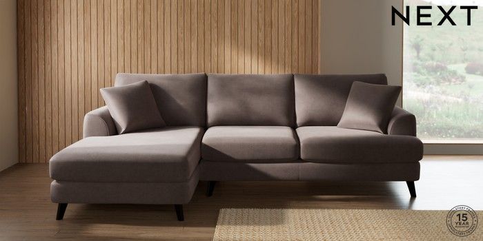 7.2.4 Buy Parker Medium Sofa Chaise - Left Hand Luxe Chenille Mink Brown Low Retro Tapered - Dark from the Next UK online shop Click here to use our accessible website
