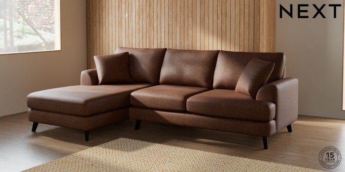 7.2.5 Buy Parker Medium Sofa Chaise - Left Hand Monza Faux Leather Easy Clean Chestnut Brown Low Retro Tapered - Dark from the Next UK online shop Click here to use our accessible website
