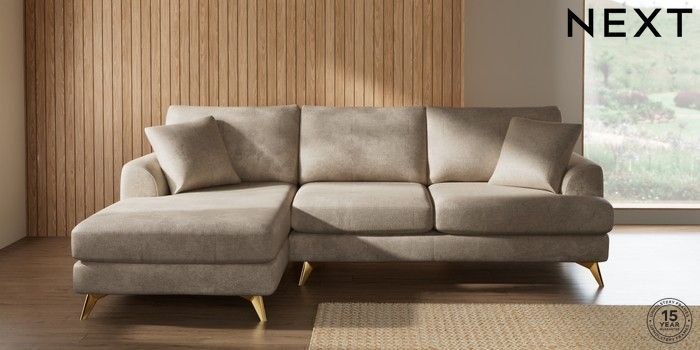 7.2.10 Buy Parker Medium Sofa Chaise - Left Hand Plush Chenille Light Natural High Metal - Brass from the Next UK online shop Click here to use our accessible website