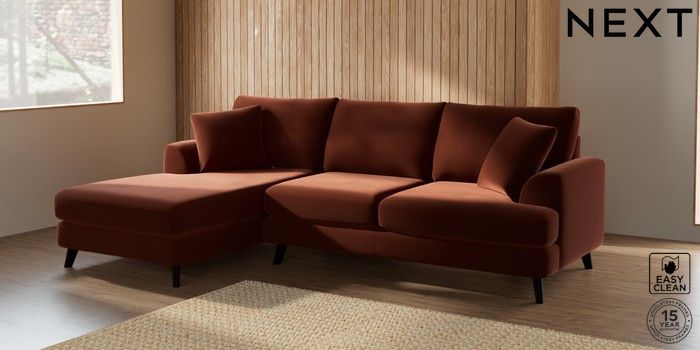 7.2.5 Buy Parker Medium Sofa Chaise - Left Hand Plush Velvet Easy Clean Ginger Orange Low Retro Tapered - Dark from the Next UK online shop Click here to use our accessible website