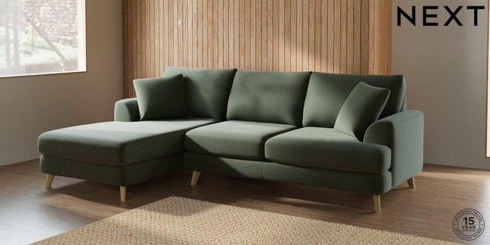 7.2.5 Buy Parker Medium Sofa Chaise - Left Hand Relaxed Linen Look Dark Green Low Retro Tapered - Light from the Next UK online shop Click here to use our accessible website